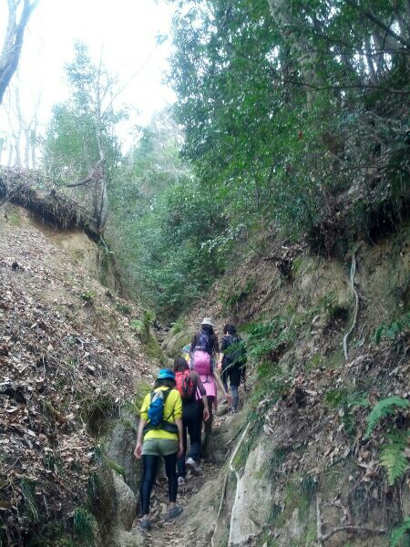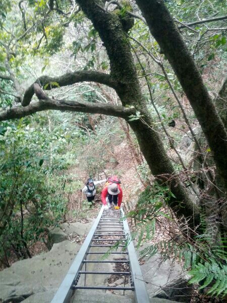 下から見るとかなりの傾斜を手袋はめて両手両足で!こんな梯子も登りつつ、次は雄滝へ。